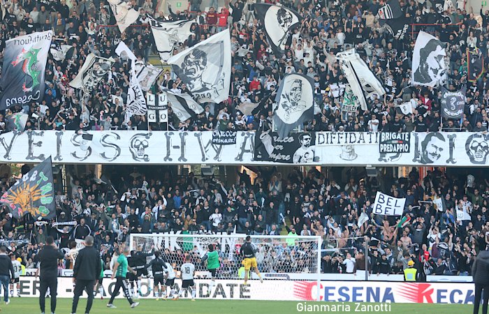 Dopo il triplice fischio la festa dei calciatori del Cesena sotto la curva dei propri tifosi