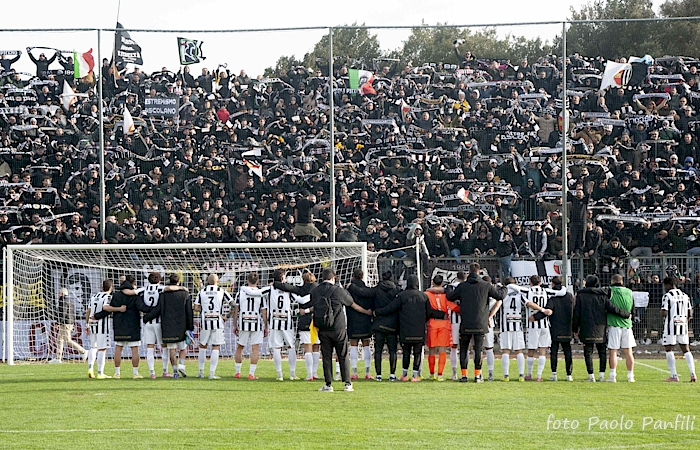 Tifosi ascolani festanti con i calciatori bianconeri dopo il novantesimo